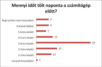 A legjellemzőbb a 3-4 órás számítógép-használat napi szinten, ez a megkérdezettek 38%-a, ez megegyezik az országos átlaggal, felmérést Fehér Péter végzett, aki nemcsak pedagógus hallgatók körében végezte. A 14-18 éves korosztály napi szinten 5-6 órát használja, de nem ritka a 6 óránál több idő sem. Egyetlen dologban tér el. Ami azonban érdekes, bár nem meglepő: a napi szinten nem használók aránya, ez a mi esetünkben 9 %, a középiskolás korosztály esetében 0,01%.