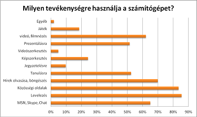 Mielőtt részletesen kitérnék arra, hogy digitális lázban égnek-e a hallgatóink, szeretnék emlékeztetni a netgenerációról szóló publikációra. (Fehér-Hornyák: 2010) A szerzők a felmérést a 14-24 éves korosztályban végezték, tehát megállapításaik igazak a felsőoktatásban levő hallgatókra is, mely szerint sokat használják a számítógépet, ám profizmusuk inkább a csetelésben, a közösségi oldalakon való részvételben nyilvánul meg. Vajon igazak-e ezek a megállapítások a jelenlegi pedagógushallgatókra?