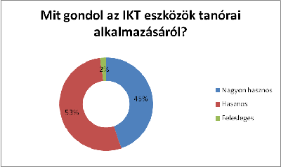 Az IKT eszközhasználatra vonatkozó motiváltságuk nagyon jó. 45% nagyon hasznosnak, 53% hasznosnak gondolja az oktatásban betöltött szerepét. Csupán 2%, írta, hogy az IKT eszközök használata az oktatásban felesleges.