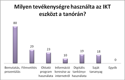 A hallgatók azon megítéléséből, hogy „Milyen tevékenységre használta az IKT eszközt a tanórán, nagyon erősen kimutatható, hogy a tanórákon még mindig vezetnek a frontális módszerek: motiváció, figyelemfelkeltés, bemutatás, az egyéni képességfejlesztés, felzárkóztatás, feladatadás nem jellemző. Vajon miért gondolja úgy a hallgató, hogy az a technikai eszköz, amit naponta átlagban 3-4 órát használ, állítása szerint használja tanulásra is, egy tanórán „csak” bemutatásra, prezentálásra, motivációra alkalmas. Azt hiszem, hogy a válasz egyszerű: erre kapnak mintát! Megerősíti ezt az a tény is, hogy a főiskolai, egyetemi oktatók zöme is prezentációra, bemutatásra használja a számítógépet az oktatásban. Nagyobb részt az általános iskola felső tagozatára, középiskolai, illetve a főiskolai évek tanításaira emlékszik. A hallgató, innen veszi a mintát! Erős a mintakövetése, a bevált gyakorlathoz való ragaszkodása, ezek döntően meghatározzák a pedagógus nemcsak jelenbeli, hanem a jövőbeni tevékenységét is.