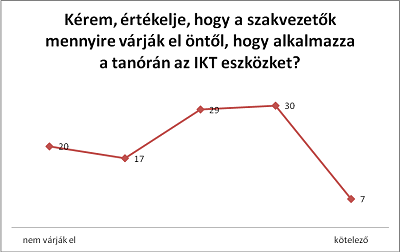 Erre a kérdésre csupán 3% (n=3) mondta, hogy nem állt rendelkezésére semmilyen IKT eszköz, tehát nem lehetett kizáró ok az eszköz hiánya. Az iskolák zömében számítógép, laptop + projektor állt rendelkezésre. 70%-ban már megjelent az interaktív tábla is. Még nem jellemző a szavazóegység, illetve a tanulói laptop. Ez azonban nem ad hű képet, hiszen itt a hallgatók megítéléséről van szó, nem biztos, hogy pontos ismerete van az iskola infrastrukturális hátteréről. Ha nem az eszközhiány okozza, vajon befolyásoló tényező-e a szakvezetők elvárásai?